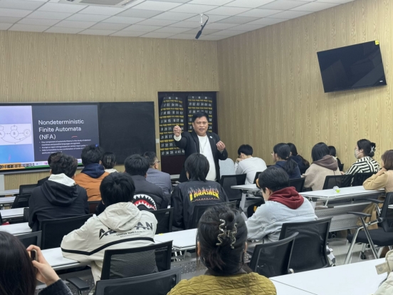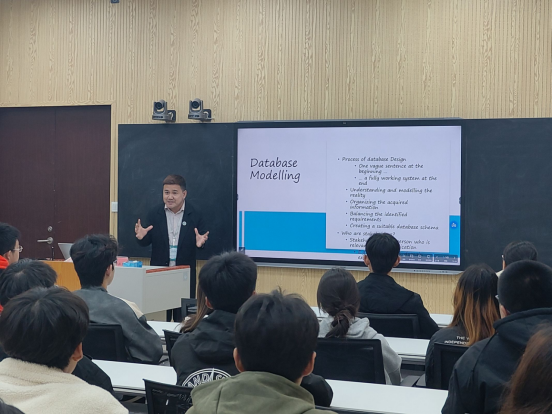 下午,格里·康提罗和迈克尔·布拉克两位专家在明理楼智慧教室分别为本科生上课。格里·康提罗以“自动机理论”为题给学生讲解了正则表达式的应用。他以标志符识别为引入,讲解了有效及无效的各类情况,通过画图和举例相结合的方式,生动形象地阐释了这一原理。迈克尔·布拉克以“数据库建模”为题为学生普及了数据库设计过程、数据库建模概念和术语以及建模的具体步骤。师生之间互动频繁,讲解深入浅出,学生们加深了对数据库建模相关领域的了解。