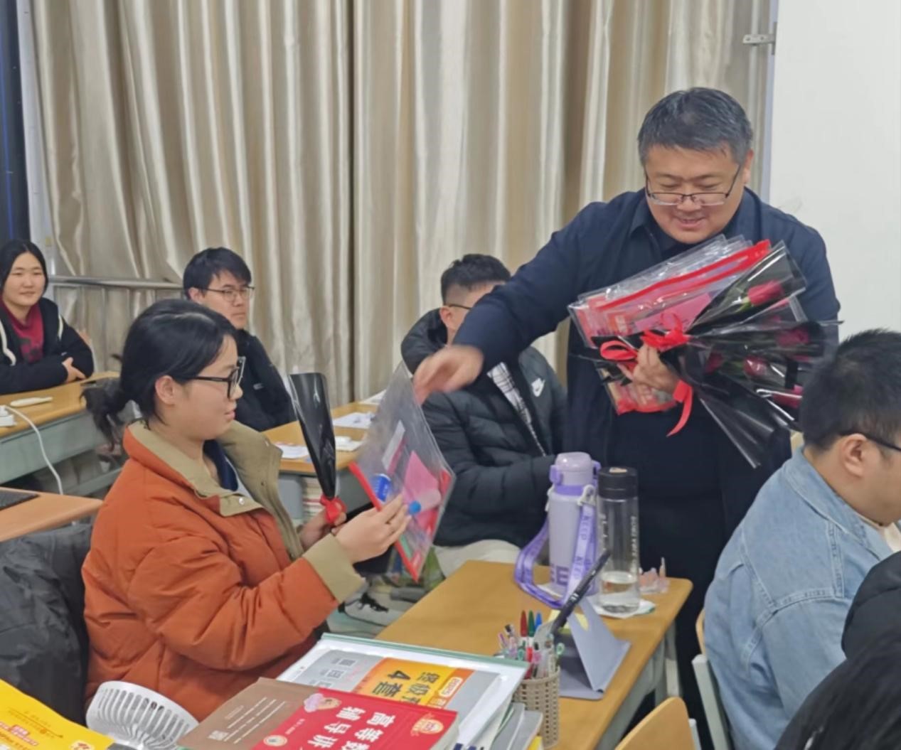 在考研冲刺的关键时刻,校党委委员、组织部部长杨斌及学院主要负责人亲临自习室,为考研学子们送上精心准备的鲜花和考试用品,传递学院对他们的美好祝愿与殷切期望。领导们与同学们亲切交流,鼓励他们在最后关键节点要保持积极心态,铆足冲劲,勇往直前。同学们深受感动,他们表示,备考的这段日子虽然辛苦,但学院的支持与鼓励让他们从未感到孤单。这些充满仪式感的礼物和话语,不仅增强了他们的备考信心,也让他们深刻体会到学院是他们坚实的后盾。在即将到来的考试中,他们将带着学院的期望与祝福,全力以赴,力争在考场上发挥出最佳水平,为自己的未来努力拼搏,为学院争光添彩。