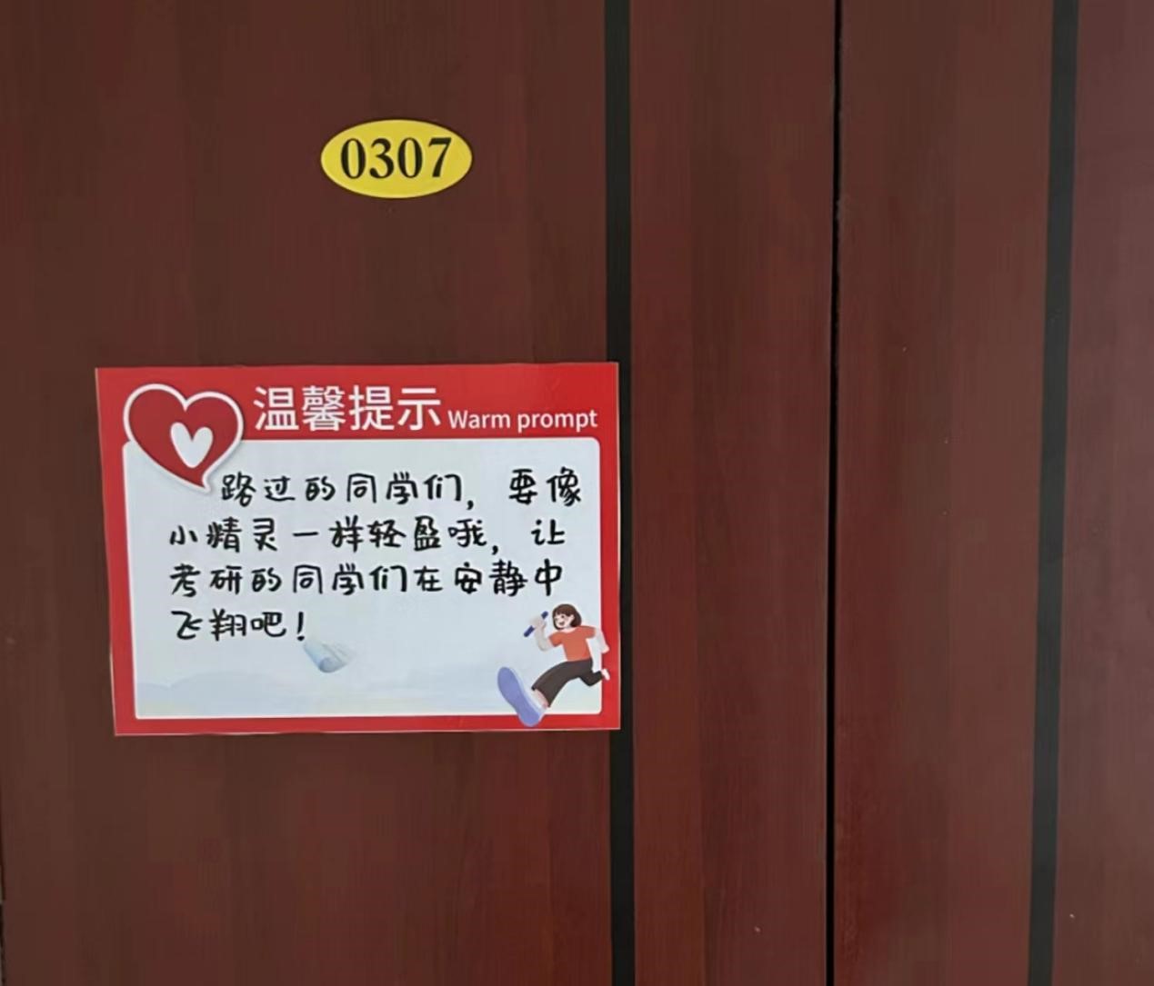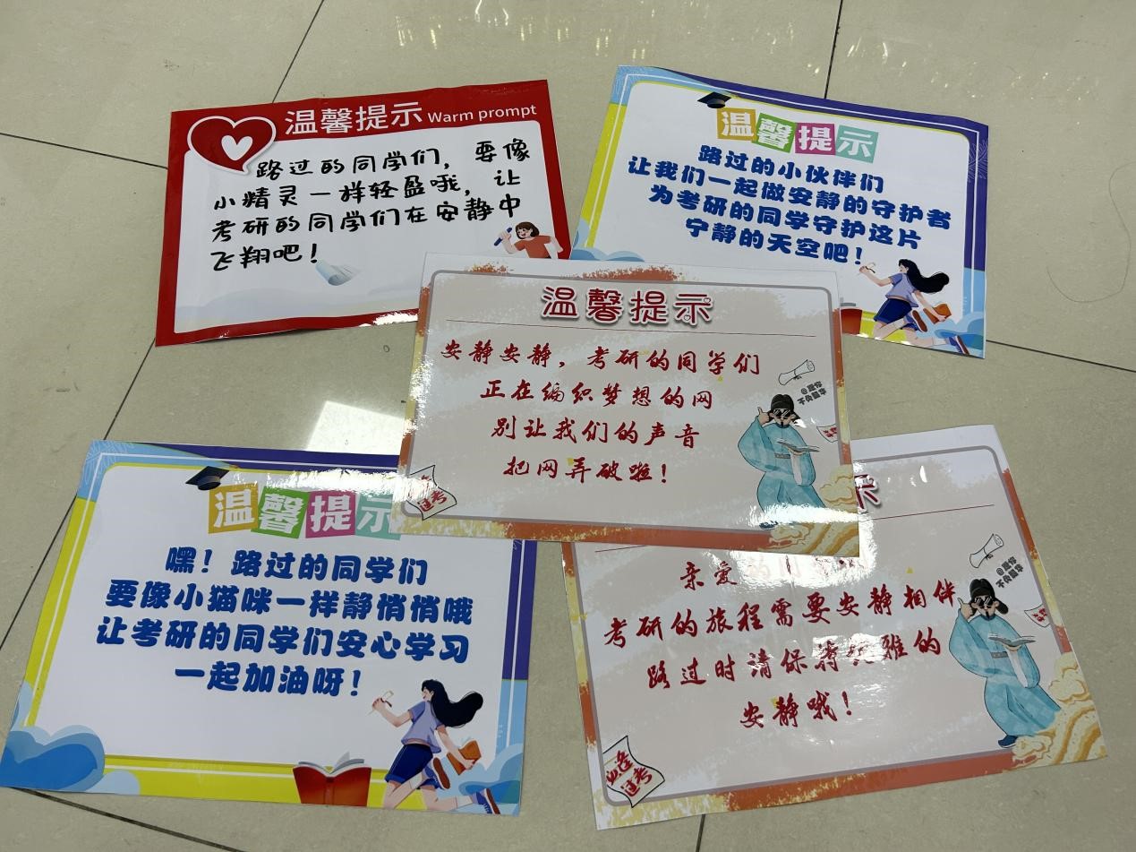 学院开展“建设静音环境,助力考研学子”活动,组织志愿者在考研自习室门上张贴温馨提示,倡导全院师生在经过考研自习室时保持轻声细语,为考研学子营造安静、祥和的备考环境。备考期间,每一分每一秒都弥足珍贵,安静的学习氛围有助于同学们集中精力,做考研的最后冲刺。