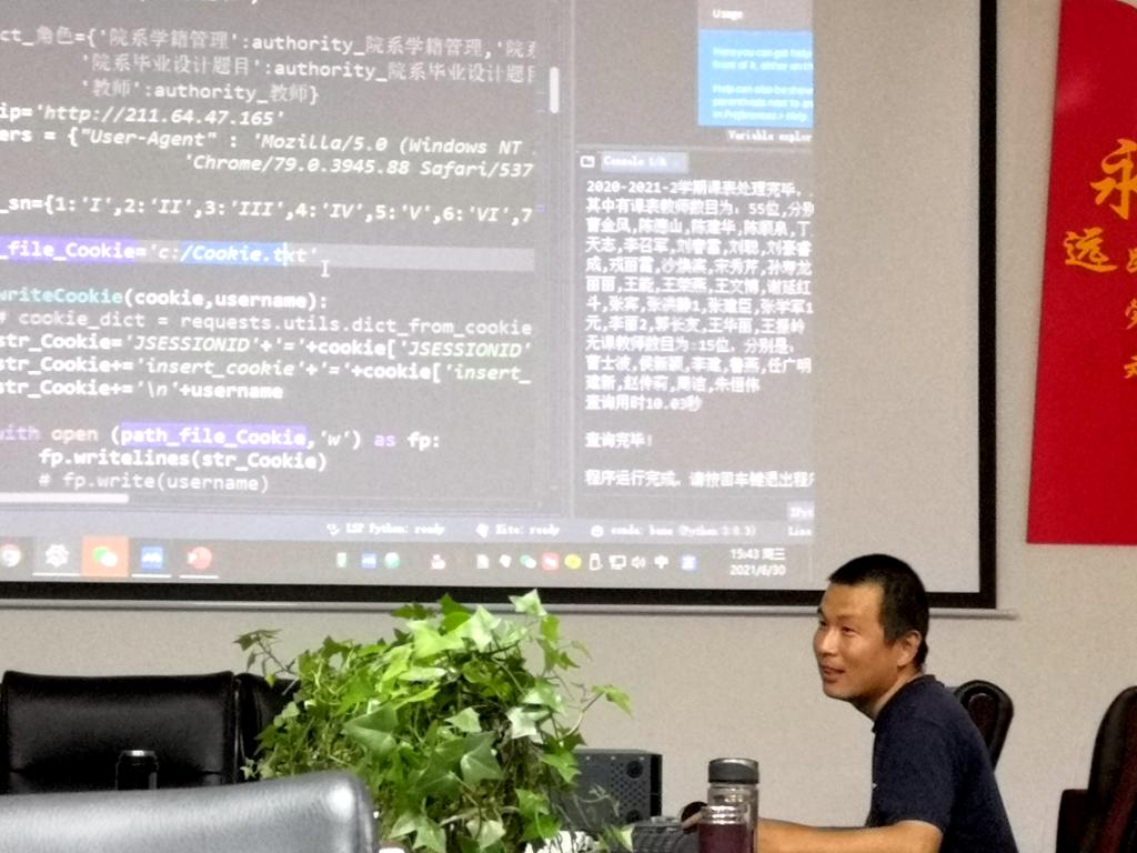 主讲人张建新老师从自己负责的学生电子档案,毕业生资格审查、班级课表、教师课表、教室课表,班级期末成绩汇总、班级开课情况等方面进行了详细的介绍。张老师采用C、C++、C#、Python等语言,根据汇总数据的特点分别编写对应的查询程序代码,从教务系统中爬取数据;根据录入数据的特点编写程序代码上传批量数据。数据的处理不仅准确,而且时间由原来的几小时缩短为十几秒,极大地提高了工作效率。另外,张老师还为我校档案室、物理与电子信息学院、教师教育学院等部门编写数据处理软件,受到了各部门老师的好评。