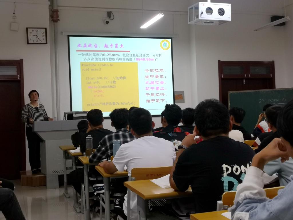 10月4日上午第2节,我院部分老师进入了宋秀芹老师的《程序设计基础》课堂进行观摩教学。课堂上,宋老师通过“珠峰高度”案例在讲授理论知识点的同时,契合实际的引入了老子的《道德经》中的“合抱之木,生于毫末;九层之台,起于累土;千里之行,始于足下。”,引导学生起点高低没有关系,怕的是不努力和不坚持,无论起点高低,只要肯努力和坚持,假以时日,终有所成;“52周阶梯式存钱法规则“案例引导学生在规划自己人生的最终目标时,把最终大目标分解成一个个小目标;最后,通过与该课程相关的蓝桥杯大赛的题目要求,告诫学生在学习过程中要始终保持认真、严谨的科学态度。