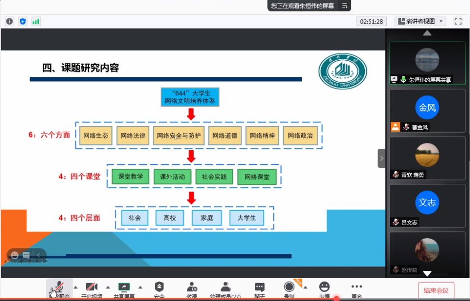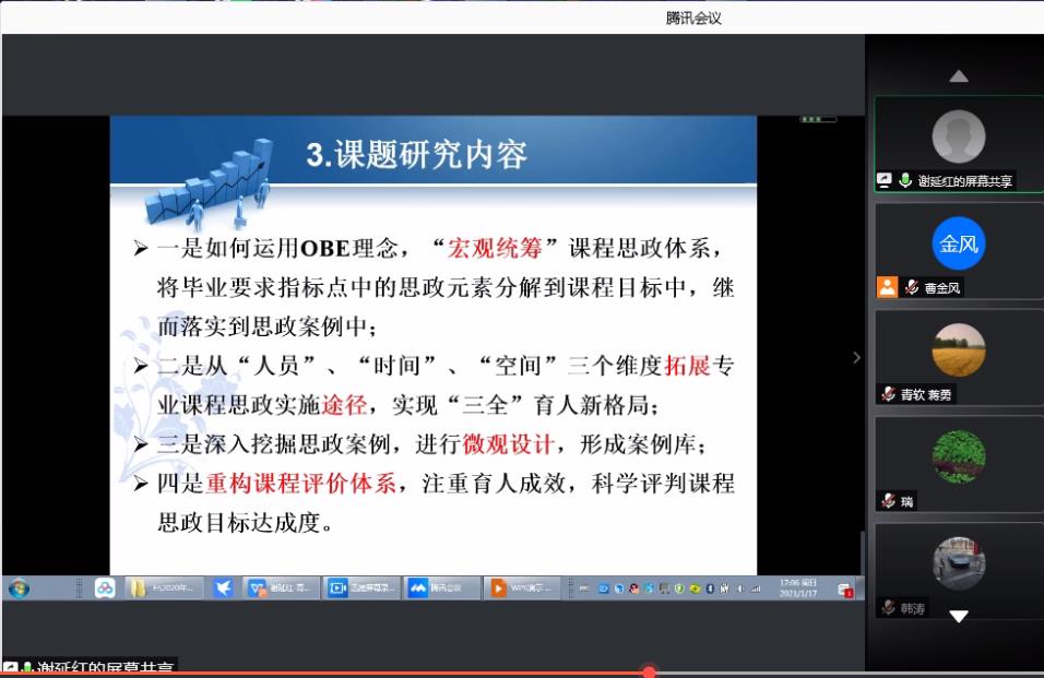 13项教研课题、15项科研课题、2项实验室建设和9项思政专项课题参与了线上评审,39项课题分组评审,教研课题、思政专项为一组,科研课题、实验室建设为一组。依据教师对项目的陈述和提交申报书质量,评审专家进行打分。经评审专家小组认真研究讨论,分类、分层的评出重点课题,面上课题和一般课题,分别给予不同额度的经费资助。