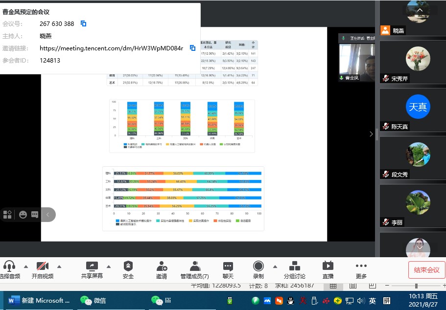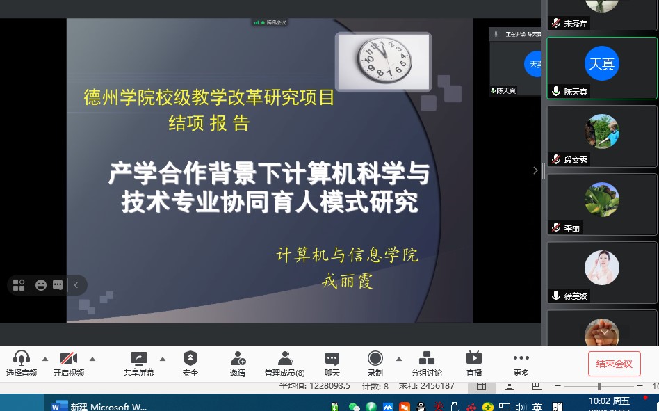 项目主持人汇报了教研项目研究与实践的过程与成果。专家实施线上线下同步、现场评议与评价。最后,专家组在阅读项目结题验收报告、听取项目负责人汇报、与项目负责人交流及专家组讨论的基础上,针对每一位老师的科研项目取得的成果给以了肯定,对结题报告提出了针对性改进建议。
