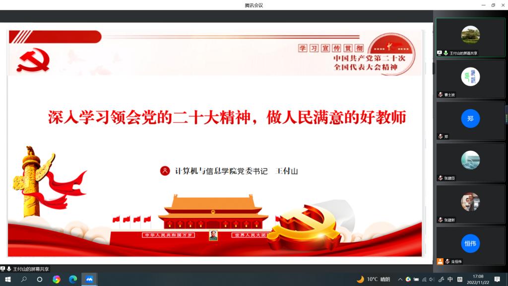 11月22日,kaiyun登录中国入口登录举办学习贯彻党的二十大精神宣讲会,学院党委书记王付山作宣讲报告。宣讲会以线上的形式召开,全体教职工参会。