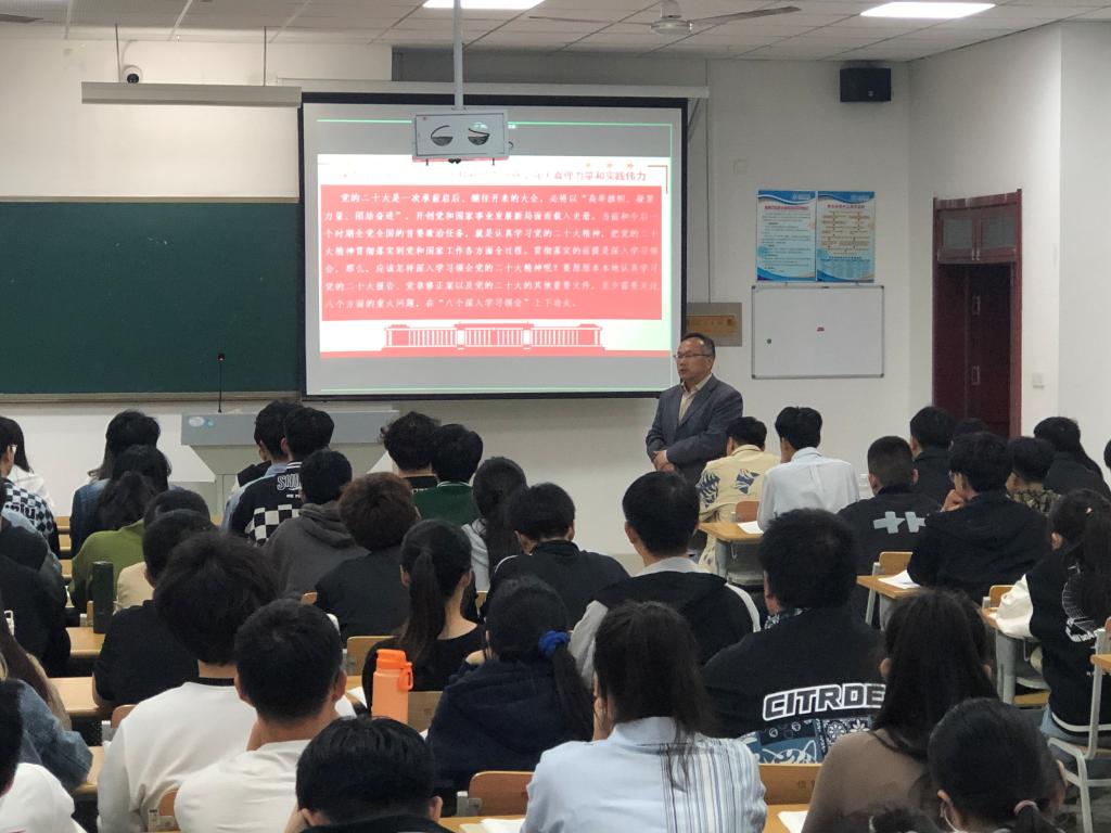 课上,王付山以《深入学习领会党的二十大精神,做有理想、敢担当、敢吃苦、肯奋斗的新时代优秀大学生》为题,从八个方面详细讲述了党的二十大精神。