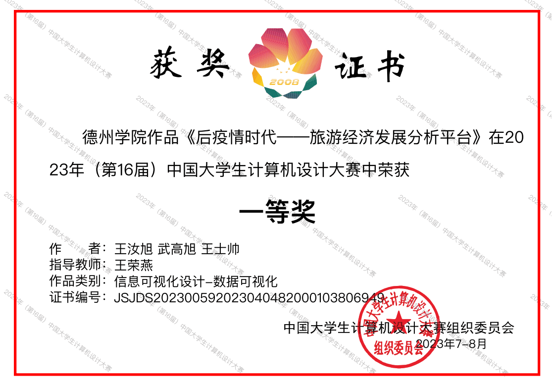 本次总决赛,王汝旭,武高旭,王士帅三名同学的参赛类别是数据可视化,完成的作品是“后疫情时代——旅游经济发展分析平台”。