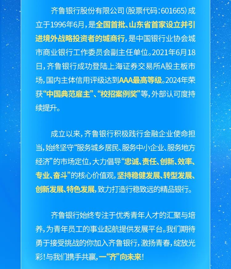 岗位速递:招聘信息|齐鲁银行2025春季校园招聘