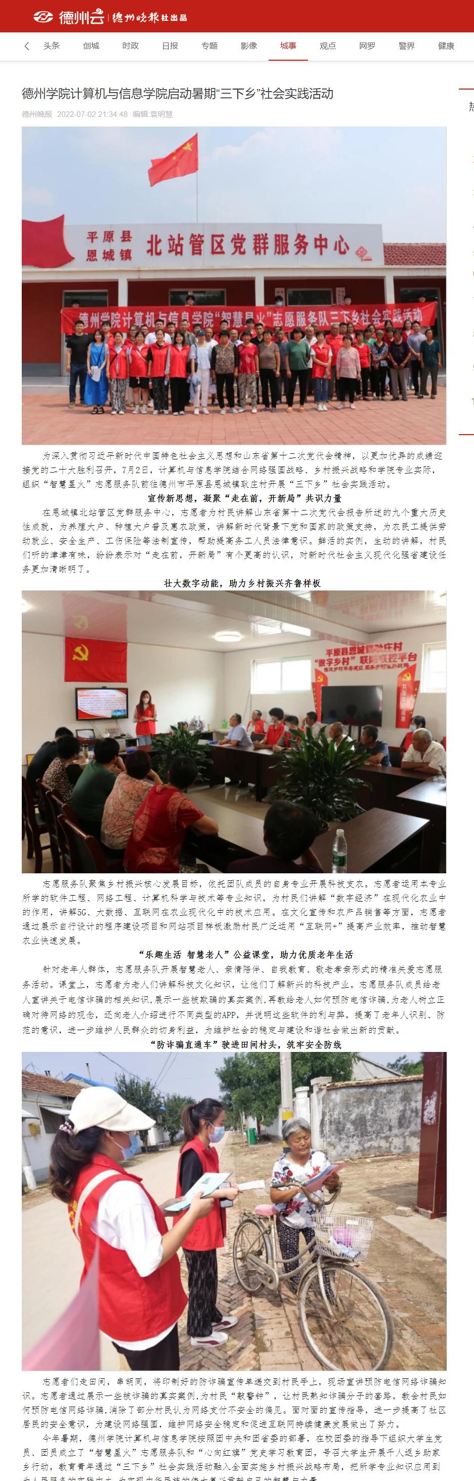 德州晚报报道我院暑期“三下乡”社会实践活动