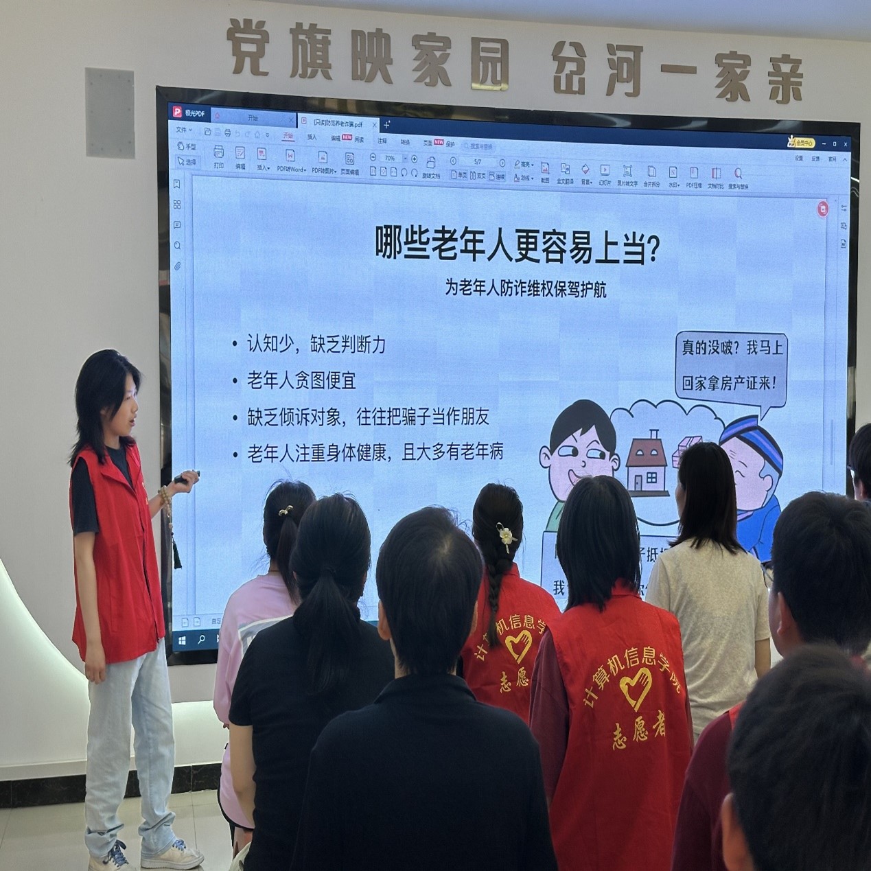 活动中,主持人首先宣读了诈骗的相关含义,使社区的老人们对诈骗有了初步的认识。接着,学生们纷纷发言介绍诈骗的常用手段,进一步加深了老人们对诈骗形式的了解。在那之后,主持人深入分析了经典案例,引导老人了解新型防诈骗的方式。与此同时,活动中还播放了相关诈骗的视频,更加生动直观地让社区的老人们感受到诈骗的危害。活动结束后,老人们纷纷表示通过此次活动增加了对诈骗行为的了解,增强了自己的安全意识,十分有意义。