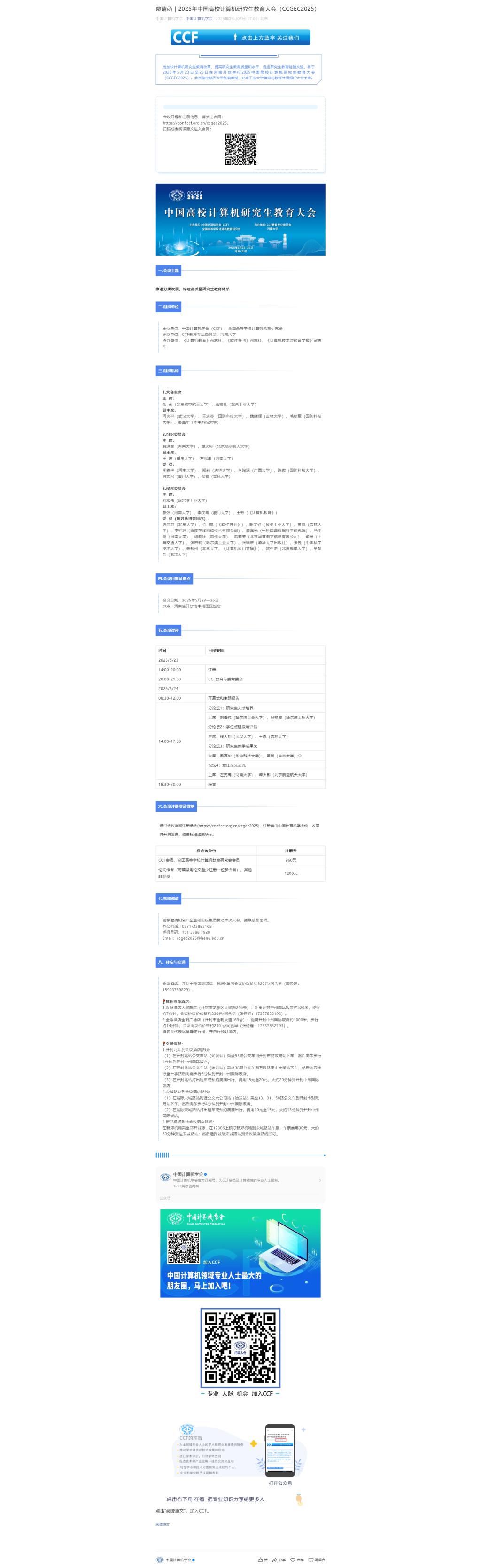 欢迎大家注册参加2025年5月23日-25日在河南开封举办的中国高校计算机研究生教育大会(CCGEC2025),本次研究生教育大会将重点关注研究生人才培养、学位点建设与评估、研究生教学成果奖等主题,邀请来自学科评议组专家、学位点建设负责人、研究生教学副院长、 教学成果奖获得者等各位专家交流分享建设经验,诚邀从事计算机研究生教育的教师、教学管理人员等注册参会;会议注册:https://conf.ccf.org.cn/ccgec2025。